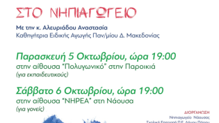 Εκδήλωση προς ενημέρωση των ενδιαφερομένων για την προσχολική ετοιμότητα και τις μαθησιακές δυσκολίες διοργανώνει η Ένωση Γονέων και Κηδεμόνων Πάρου. ...
