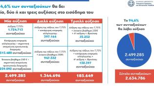 Αυξήσεις στο 94,6% των συνταξιούχων, διπλές αυξήσεις σε σχεδόν 1,3 εκατομμύρια συνταξιούχους, τριπλές αυξήσεις σε περίπου 185.000 και μια επιπλέον σύν...