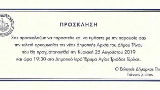 Την Κυριακή 25 Αυγούστου 2019 και ώρα 19:030 στο Δημοτικό Ιερό Ίδρυμα Αγίας Τριάδος Γύρλας θα πραγματοποιηθεί η ορκωμοσία της νέας Δημοτικής Αρχής του...