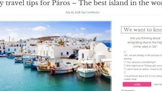 Με τίτλο: «My travel tips for Paros – The best island in the world!» η ηλεκτρονική έκδοση του ταξιδιωτικού οδηγού της Νότιας Αφρικής «ALL4WOMEN» παρου...