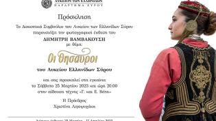 Τα εγκαίνια της έκθεσης ΄Θησαυροί του Λυκείου Ελληνίδων Σύρου ΄΄ Με την Φωτογραφική ματιά του Δημήτρη Βαμβακούση θα πραγματοποιηθούν το Σάββατο 25 Μαρ...
