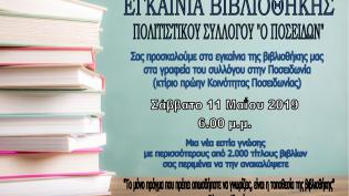 Σας προσκαλούμε στα εγκαίνια της βιβλιοθήκης του Πολιτιστικού Συλλόγου “Ο Ποσειδών”, που θα πραγματοποιηθούν το Σάββατο 11 Μαΐου 2019 και ώρα 6.00 μ.μ...