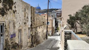 Θλίψη προκαλεί η εικόνα του παραδοσιακού πλακόστρωτου που οδηγεί στην Αστυνομική Διεύθυνση Ν. Αιγαίου, στη συνοικία Βαπόρια της Ερμούπολης, καθώς σε ό...