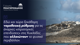 Γ. Πολυχρονάκος: "Εδώ και τώρα ξεκάθαρη νομοθετική ρύθμιση για τις άναρχες στρατηγικές επενδύσεις στις Κυκλάδες που αλλοιώνουν το φυσικό περιβάλλον"