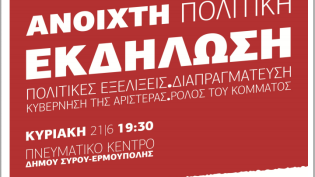 Την Κυριακή 21 Ιουνίου στις 7.30 μ.μ. στην Αίθουσα Παναγούλη του Πνευματικού Κέντρου του Δήμου Σύρου-Ερμούπολης, θα πραγματοποιηθεί ανοιχτή πολιτική ε...