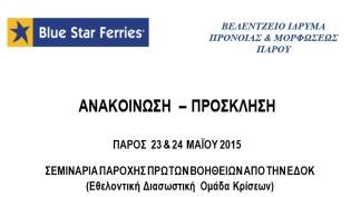 Με την πρωτοβουλία της Blue Star Ferries και με την υποστήριξη του Βελεντζείου Ιδρύματος Πρόνοιας και Μορφώσεως θα πραγματοποιηθούν δωρεάν δύο σεμινάρ...