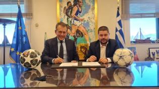 Ο αναπληρωτής υπουργός Παιδείας, Θρησκευμάτων, Αθλητισμού, Γιάννης Βρούτσης και ο πρόεδρος της Ελληνικής Ποδοσφαιρικής Ομοσπονδίας, Μάκης Γκαγκάτσης υ...