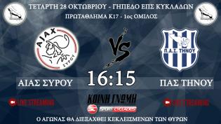 Παρακολουθείστε ζωντανά από το γήπεδο της Ερμούπολης – ΕΠΣ Κυκλάδων το παιχνίδι πρωταθλήματος για την 1η αγωνιστική του Κ-17, μεταξύ των ομάδων Αίαντα...