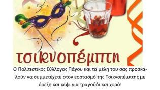 Ο Πολιτιστικός Σύλλογος Πάγου και τα μέλη του σας προσκαλούν να συμμετέχετε στον εορτασμό της Τσικνοπέμπτης με όρεξη και κέφι για τραγούδι και χορό! ...