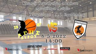 Ο Άρης Σύρου επικράτησε του Α.Ο. Ερμούπολης με 74-50 στο τοπικό ντέρμπι του νησιού, με τη διαφορά πως το παιχνίδι των ανδρών έγινε στο κλειστό της Μυκ...