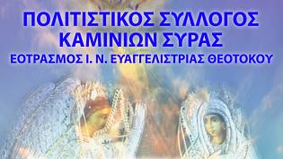 Ο Πολιτιστικός Σύλλογος Καμινίων Σύρας προσκαλεί τους φίλους του στις εκδηλώσεις για τον εορτασμό του Ευαγγελισμού της Θεοτόκου. Το Σάββατο 24 Μαρτ...