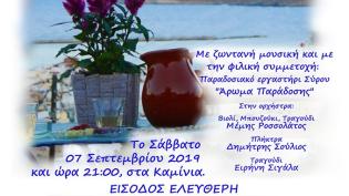 Ο Πολιτιστικός Σύλλογος Καμινίων Σύρου προσκαλεί στην καθιερωμένη πλέον εκδήλωση, της νησιώτικης βραδιάς, η οποία θα πραγματοποιηθεί το Σάββατο 7 Σεπτεμβρίου και ώρα 9 το βράδυ.