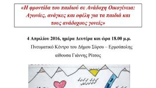 Στις 4 Απριλίου 2016, ημέρα Δευτέρα και ώρα 18.00΄, στο Πνευματικό Κέντρο του Δήμου Σύρου – Ερμούπολης, αίθουσα Γιάννη Ρίτσου, πρόκειται να διενεργηθε...