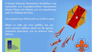 Πρόσκληση για τα κούλουμα από την Ένωση Παλαιών Προσκόπων Κυκλάδων για την Καθαρά Δευτέρα στο Προσκοπικό Κέντρο στον Βήσσα, στις 11 το πρωί.