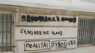 Ένα ακόμη κτίριο – κόσμημα στο κέντρο της Ερμούπολης αποδεικνύεται “θύμα” της μανίας γκράφιτι, συνθημάτων, ακόμη όμως και ακατάληπτων μηνυμάτων που έχ...