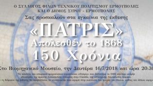 Ο Σύλλογος Φίλων Τεχνικού Πολιτισμού Ερμούπολης και ο Δήμος Σύρου – Ερμούπολης σας προσκαλούν στα εγκαίνια της έκθεσης «ΠΑΤΡΙΣ» Απολεσθέν το 1868 150 ...