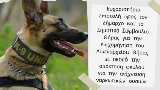 Με ομόφωνη απόφασή του το Δημοτικό Συμβούλιο Θήρας ενέκρινε την επιχορήγηση του Λιμεναρχείου Θήρας για την απόκτηση σκύλου για την ανίχνευση ναρκωτικώ...