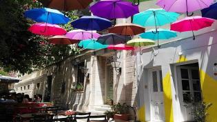 Μία άκρως εντυπωσιακή εικόνα σε μικρό πεζόδρομο της Ερμούπολης προσδίδει η καλλιτεχνική σύνθεση πολύχρωμων αιωρούμενων... ομπρελών, οι οποίες και τοπο...