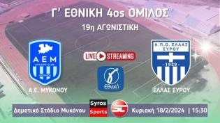 Παρακολουθήστε σε ζωντανή μετάδοση (18/2 | 15:30) από το στάδιο της Μυκόνου την αναμέτρηση της 23ης αγωνιστικής του 3ου ομίλου της Γ' Εθνικής μεταξύ τ...