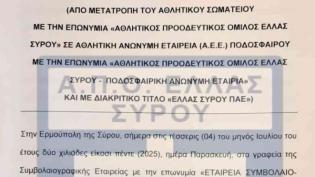 Ιστορική ημέρα η 4η Ιουλίου 2025 για την ομάδα της Σύρου, καθώς ολοκληρώθηκε και επίσημα η σύσταση της ΠΑΕ ΕΛΛΑΣ ΣΥΡΟΥ, με την καταχώρηση της νέας Ποδ...