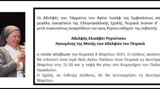 Σύσσωμη η Ελληνογαλλική Σχολή του Πειραιά Jeanne d' Arc αποχαιρετά σήμερα με ιδιαίτερη συγκίνηση την Αδελφή Ελισάβετ Ρηγούτσου, Ηγουμένη της Μονής Αδε...