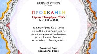 Τα καταστήματα Kois Optics και η ZEISS θα πραγματοποιήσουν ενημερωτική εκδήλωση για την παιδική μυωπία και την Myopia Management. Η εκδήλωση θα λάβ...
