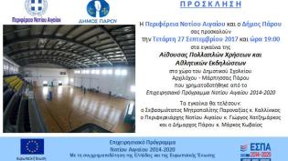 Την Τετάρτη 27 Σεπτεμβρίου 2017 και ώρα 19:00, θα πραγματοποιηθούν τα εγκαίνια της Αίθουσας Πολλαπλών Χρήσεων και Αθλητικών Εκδηλώσεων στο χώρο του Δη...